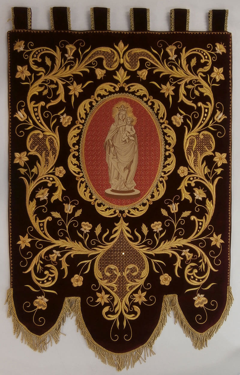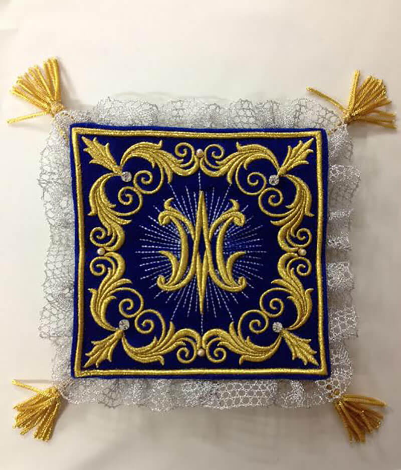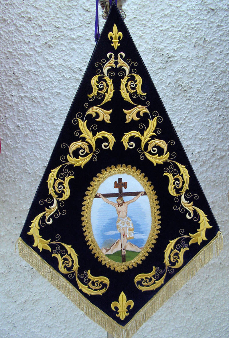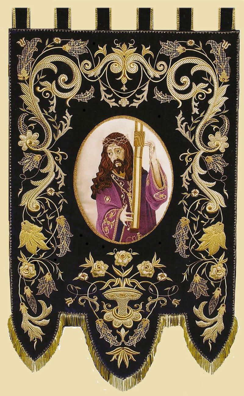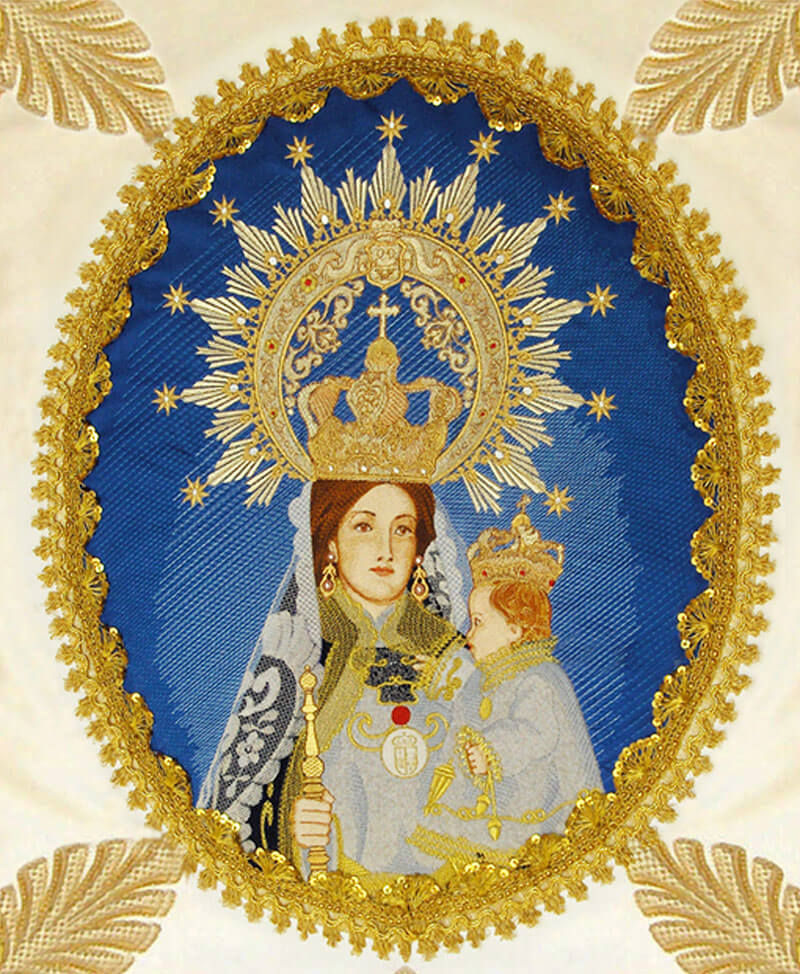 Ofrecemos trabajos religiosos, que van desde los motivos más tradicionales, con hilos dorados y relieves, hasta los más actuales, adaptándonos a cualquier diseño y requerimiento de nuestros clientes, como la personalización de imágenes representativas de cada iglesia o cofradía, así como un catálogo propio, con gran variedad, en el que puede elegir el bordado que mejor se adapte a su gusto y su presupuesto.